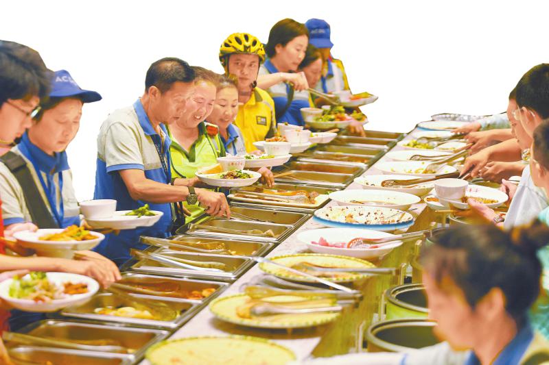 “大姐、大哥,今天早餐有8道菜,还有素包子、馒头、米糕和小米粥,大家请按需取用!”厨师林新华的招呼声伴着饭菜香传来。