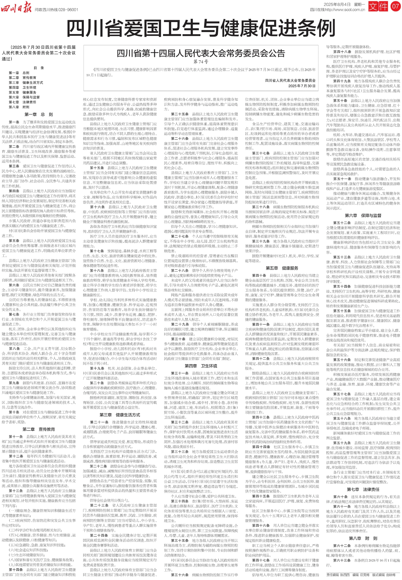 《四川省爱国卫生与健康促进条例》已由四川省第十四届人民代表大会常务委员会第二十次会议于2025年7月30日通过,现予公布,自2025年10月1日起施行。