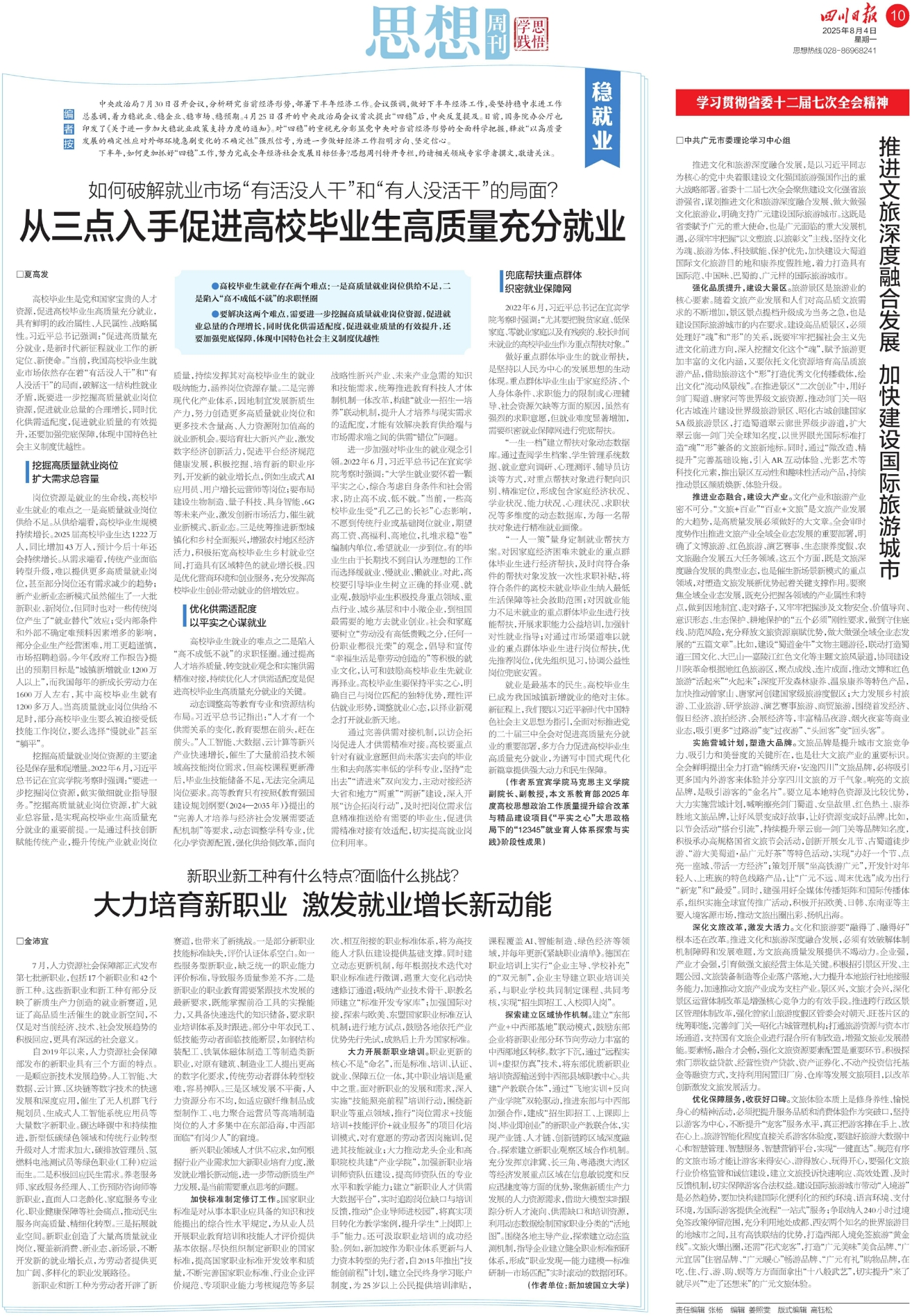 高校毕业生是党和国家宝贵的人才资源,促进高校毕业生高质量充分就业,具有鲜明的政治属性、人民属性、战略属性。习近平总书记强调:“促进高质量充分就业,是新时代新征程就业工作的新定位、新使命。”当前,我国高校毕业生就业市场依然存在着“有活没人干”和“有人没活干”的局面,破解这一结构性就业矛盾,既要进一步挖掘高质量就业岗位资源,促进就业总量的合理增长,同时优化供需适配度,促进就业质量的有效提升,还要加强兜底保障,体现中国特色社会主义制度优越性。