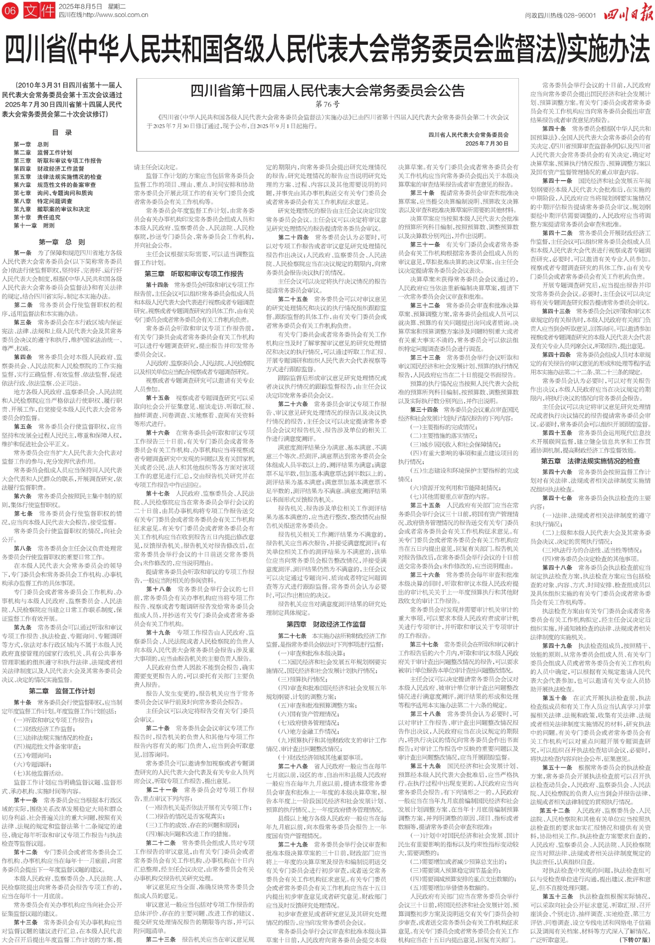 《四川省〈中华人民共和国各级人民代表大会常务委员会监督法〉实施办法》已由四川省第十四届人民代表大会常务委员会第二十次会议于2025年7月30日修订通过,现予公布,自2025年9月1日起施行。