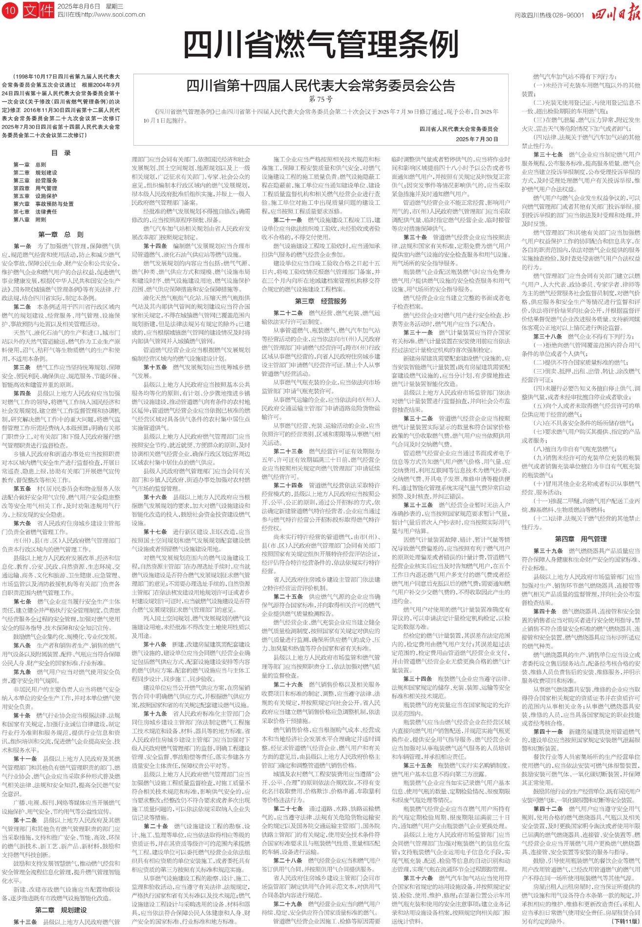 第75号《四川省燃气管理条例》已由四川省第十四届人民代表大会常务委员会第二十次会议于2025年7月30日修订通过,现予公布,自2025年10月1日起施行。