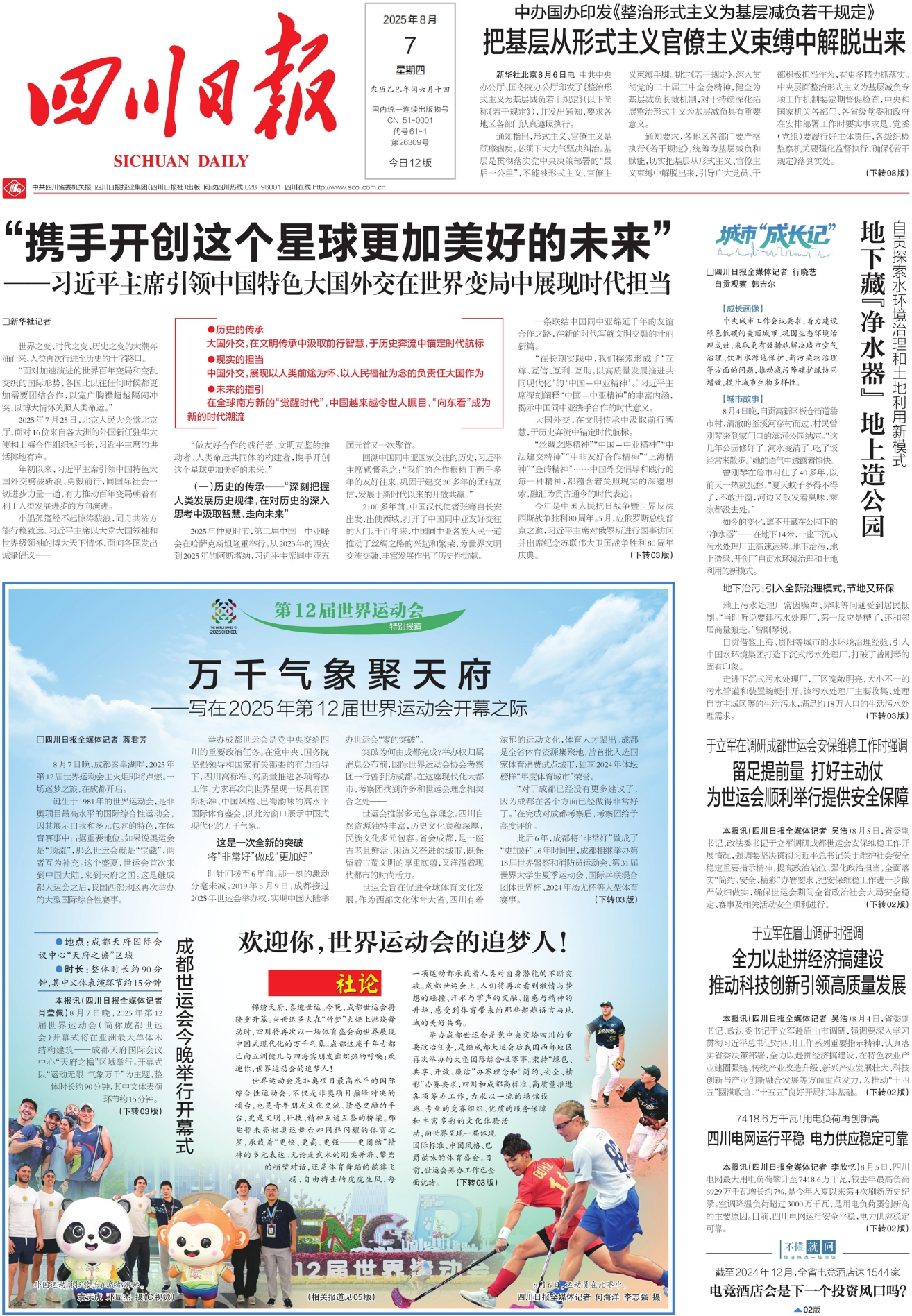 成都世运会的主题是“运动无限 气象万千”。这万千的气象,属于每一位运动员,也属于每一位参与者。赛场内外,20余款“四川造”前沿科技产品在引导、保障等方面发挥作用,氢能公交车、光伏照明系统、智能路标等新能源设施随处可见,5G网络深度覆盖让“智慧世运”可触可感……以智慧与绿色铺就的“未来模式”,为全球赛事树立了崭新的科技和生态标杆。世运会的成功举办,也将加快推动四川群众体育、竞技体育和体育产业协调发展,更好助力四川体育强省建设。