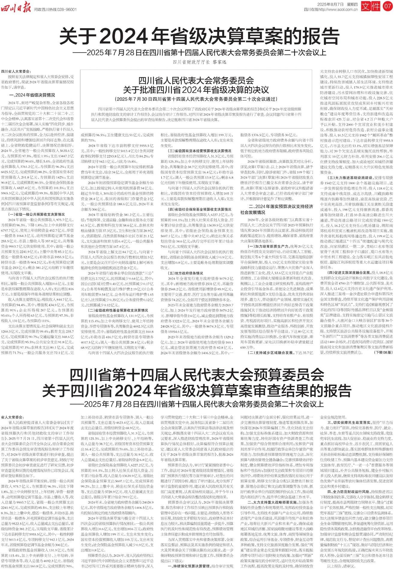(2025年7月30日四川省第十四届人民代表大会常务委员会第二十次会议通过)四川省第十四届人民代表大会常务委员会第二十次会议听取了省政府《关于2024年省级决算草案的报告》和《关于2024年度省级预算执行和其他财政收支的审计工作报告》。会议结合审计工作报告,对四川省2024年省级决算草案及报告进行了审查。会议同意四川省第十四届人民代表大会预算委员会提出的审查结果报告,决定批准四川省2024年省级决算。