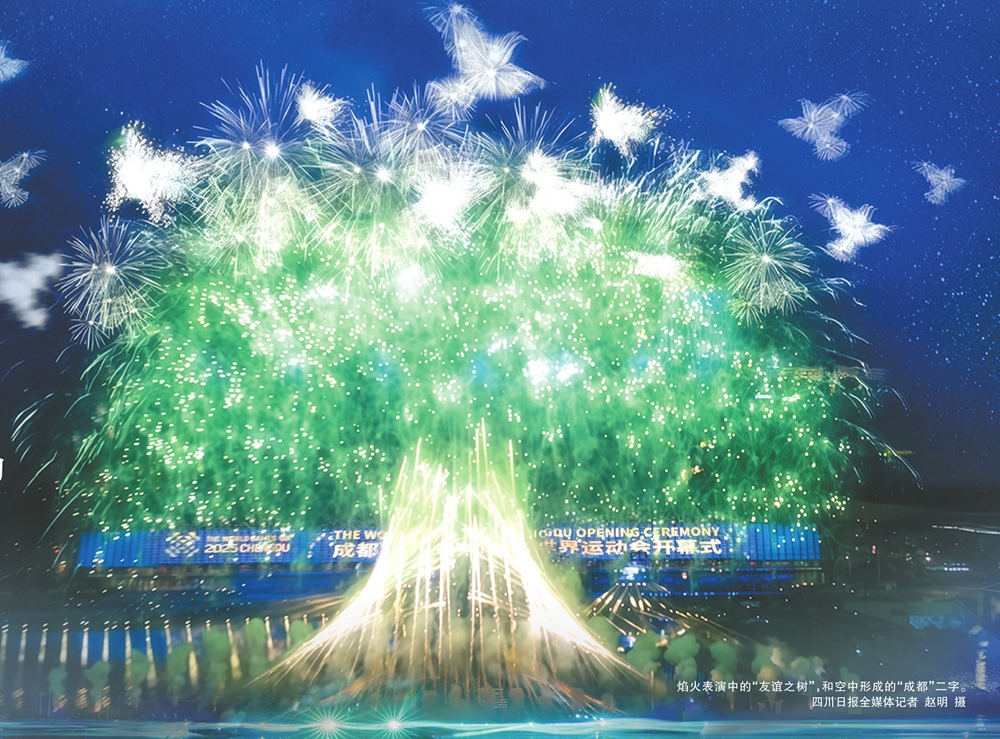 •   成都世运会开幕式焰火绚烂,主题曲表演结束后,一棵以成都金沙遗址大树根遗迹和四川活化石珙桐树为创意灵感的“友谊之树”,在夜空中缓缓生长,开满“鸽子花”