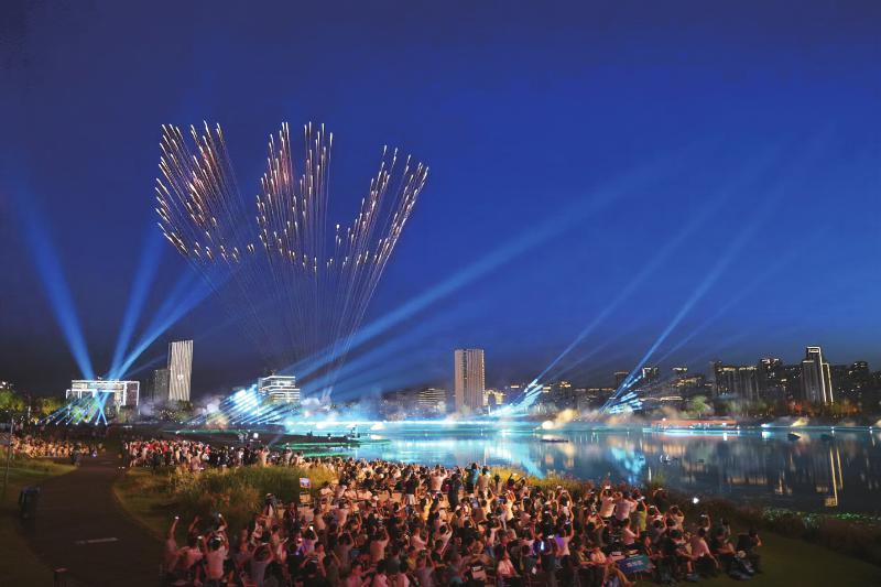湖水波光粼粼,星光洒满绿草,远处的城市天际线高低起伏,露营椅上的观众也变成了演出中的风景……这场开幕式的独特之处在于,选择了“天府之檐”这样一个大型户外空间。