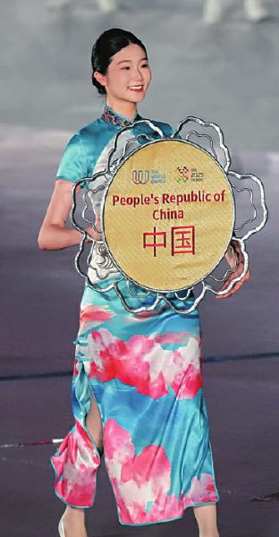 运动员入场仪式上,引导员手中的引导牌,外形是芙蓉花瓣。用材上,融入了非物质文化遗产——银花丝、蜀锦、蜀绣和漆艺。 本版图片均据新华社
