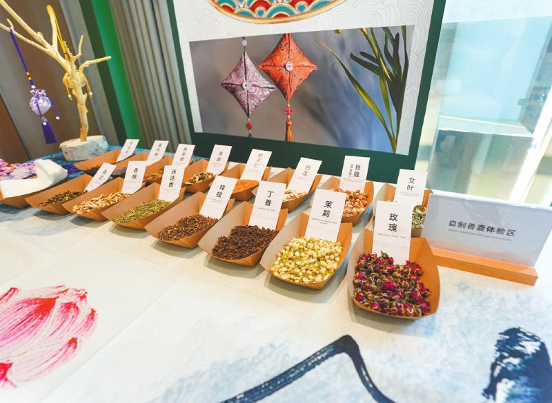 ②世运村中医药体验馆的自制香囊体验区。新华社记者 王曦 摄