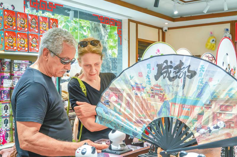 ③8月2日,外国友人在成都宽窄巷子挑选熊猫装饰品。邓显杰 摄(C视觉)