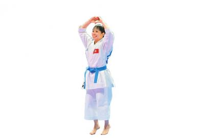 空手道夺冠后,刘慕裳对着观众“比心”庆祝。 四川日报全媒体记者 赵明 摄