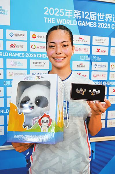 8月9日上午,新都香城体育中心,成都世运会软式曲棍球泰国队与斯洛伐克队的比赛刚结束,泰国队队员们就围成圈唱起了生日歌,场馆内随即响起了伴奏与介绍——当天是泰国运动员亚历山德拉·卡尔邦的20岁生日。伴随着欢快的生日歌大合唱,场馆工作人员给她送上了一份特别的生日礼物——成都世运会吉祥物“蜀宝”公仔,以及一对淡咖色的胸针,该胸针形象源自新都博物馆馆藏东汉羽人画像砖。