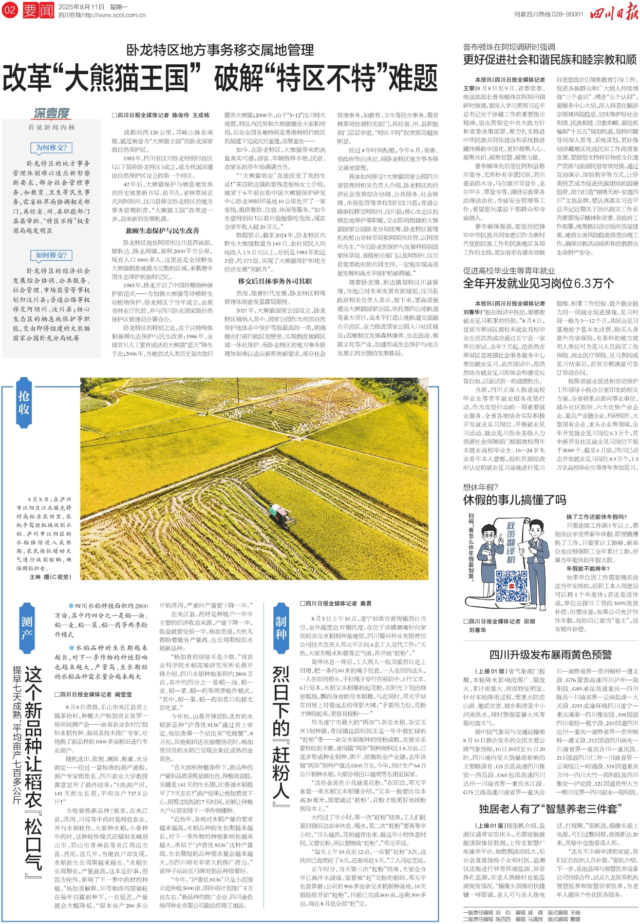 8月5日上午10点,遂宁射洪市青岗镇烈日当空,室外温度达37摄氏度。在位于该镇磨滩村向家坝的杂交水稻制种基地里,四川蜀兴种业有限责任公司技术负责人邓元平正向4名工人交代工作:“天热,大家先喝水和藿香正气液,再开始‘赶粉’。”