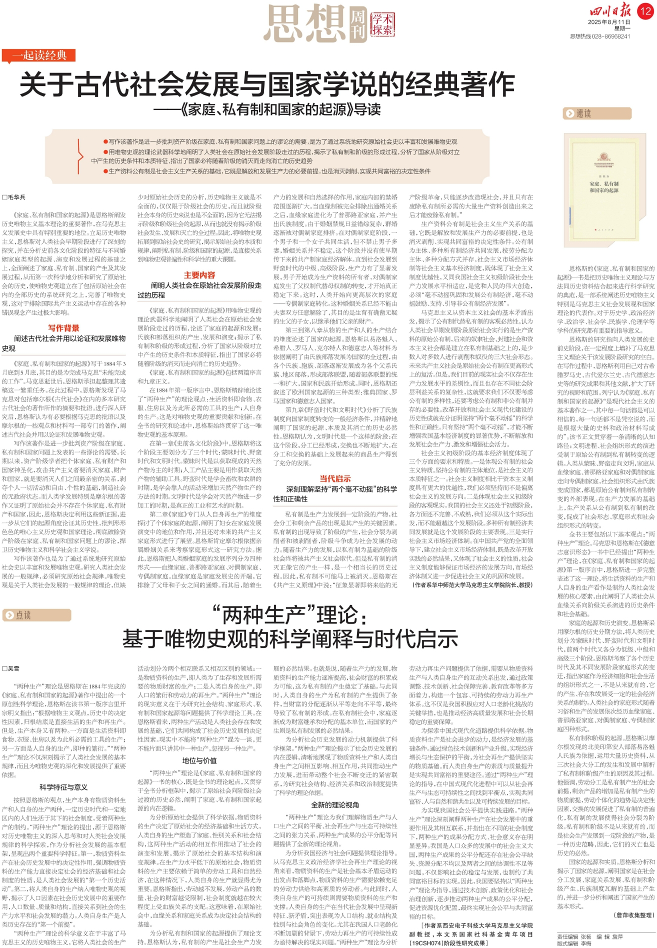 私有制和阶级的起源。恩格斯以摩尔根发现的北美印第安人部落易洛魁人氏族为依据,运用大量历史资料,从三次社会大分工的发生和发展中解析了私有制和阶级产生的原因及其过程。他强调,劳动分工是私有制产生的社会前提,剩余产品的增加是私有制产生的物质前提,劳动个体化的趋势是决定性因素,交换的发展促进了私有制的普遍化,私有制的发展使得社会分裂为阶级。私有制和阶级不是从来就有的,而是社会生产发展到一定阶段的产物,是一种历史范畴,因此,它们的灭亡也是历史的必然。