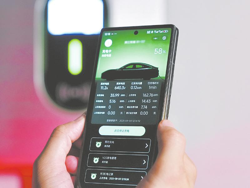 小区业主展示手机App上的充电显示界面。小区地下停车场内V2G充电桩正在给新能源汽车充电。 周宝 摄(C视觉)扫码进川观,看小区装双向充放电充电桩如何让多方获利。