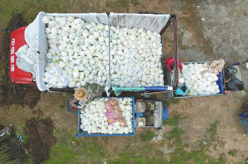 8月12日,在榆中县马坡乡上庄村,蔬菜收购商将从村民手中收购的散花菜装车(无人机照片)。当日,榆中县农业农村局组织蔬菜经销商前往山洪灾害受灾乡镇,优先收购当地村民种植的散花菜等高原夏菜,帮助大家尽快恢复生产生活。 新华社记者 范培珅 摄