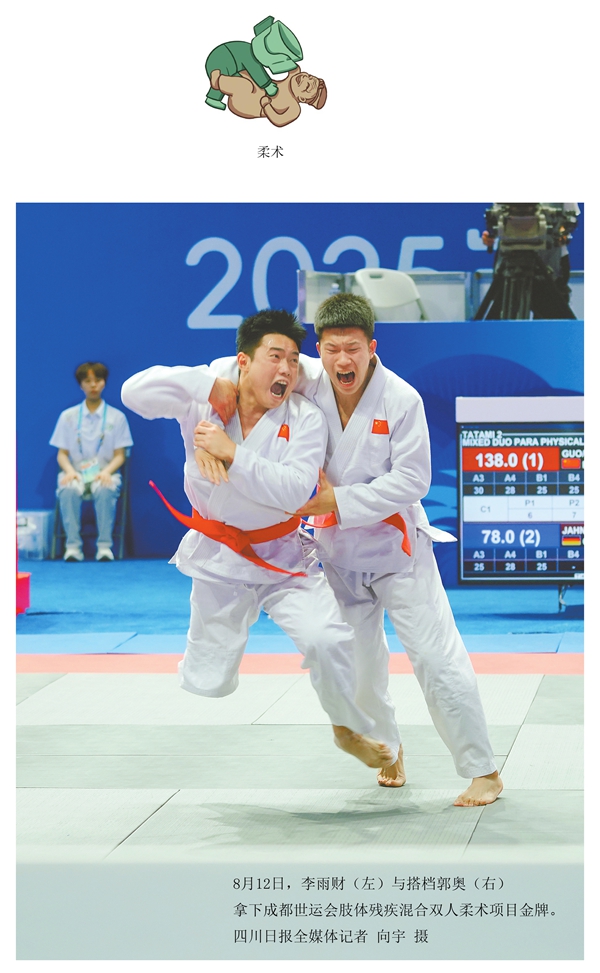李雨财的双手如铁钳般锁住对手,计时器归零时,观众席响起热烈的欢呼声——8月12日,在成都世运会柔术赛场上,这位来自四川雅安的21岁小伙与搭档郭奥,在肢体残疾混合双人柔术决赛中勇夺金牌。