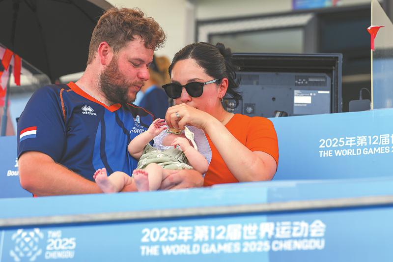 本报讯(四川日报全媒体记者 田珊 丛雨萌)8月13日,成都世运会野外射箭男子反曲弓决赛在青龙湖湿地公园举行。选手们全神贯注,展现精湛射技,而赛场边却出现别样一幕——已结束个人世运之旅的荷兰射箭队选手施洛瑟夫妇带着仅两个多月大的女儿现身赛场,为队友加油助威。两人化身为“超级奶爸奶妈”,脸上洋溢着幸福笑容,与紧张刺激的比赛氛围形成有趣反差。 这对夫妇在射箭领域成绩斐然,多次在国际赛事中斩获佳绩。此前,施洛瑟获成都世运会射准射箭男子复合弓冠军,其妻子在女子反曲弓资格赛中遗憾出局。