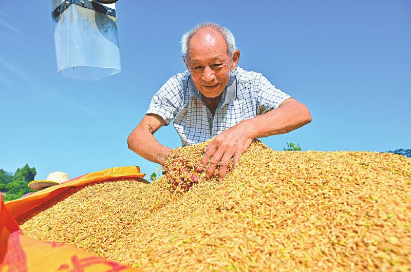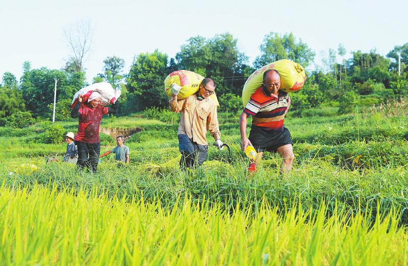 近日,泸州市纳溪区的28.9万亩水稻进入收割期。图为8月13日,纳溪区丰乐镇皂角村村民在搬运收割的稻谷。廖胜春 摄(C视觉)