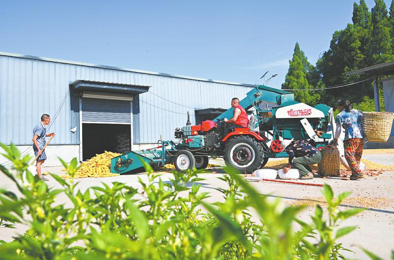 内江市东兴区杨家镇观音井村千亩玉米喜获丰收。图为8月13日,观音井村村民正在给玉米脱粒。 李建明 摄(C视觉)