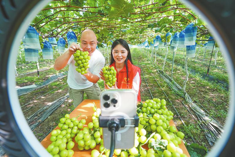 8月13日,在眉山天府新区锦江镇闽继家庭农场,青年党员志愿者通过直播推销阳光玫瑰葡萄。 翁光建 摄(C视觉)