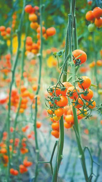 在产业园里,有一个特殊的试验棚。棚内的不同番茄植株上挂着红、橙、绿等不同颜色的果实,丝瓜藤上也挂满大大小小的瓜。“这是我们正在试种的几个新品种,目前看效果不错。”工作人员介绍。