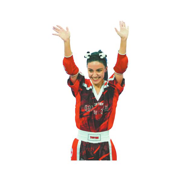 在成都世运会自由搏击女子半接触50公斤级半决赛赛场,克伦奇赢下比赛后,摘下护具,从包里拿出一个熊猫发卡,戴在头上,露出甜美的笑容,现场响起热烈掌声。