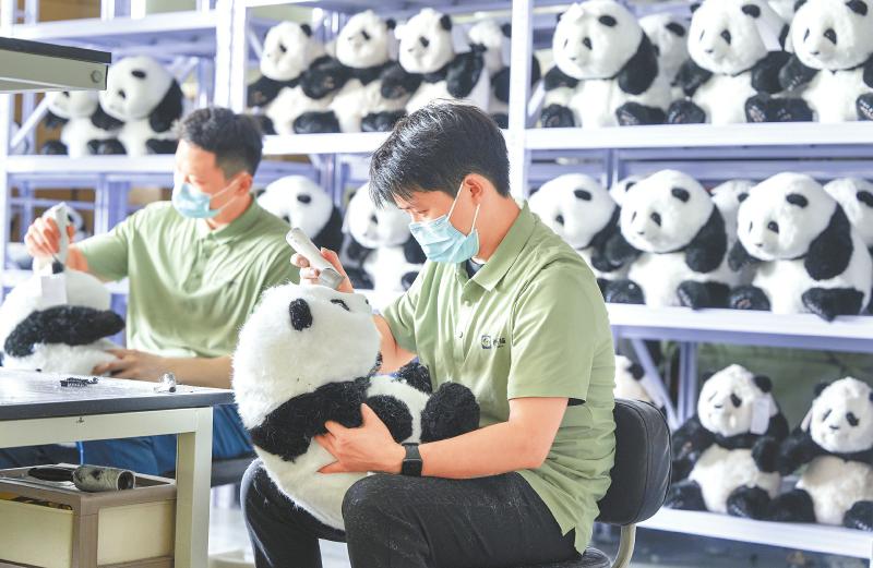8月12日,四川西柚潘达科技有限公司,生产厂房一派忙碌的景象,这是一家生产超仿真大熊猫手工玩偶的企业。隔着玻璃,造型师李东林正用一把小剪刀,给1∶1大小的“花花”修剪造型。抖落碎毛的同时,他嘴里念叨:“每卖出3只仿真大熊猫,就有一只‘花花’,她的脸盘可不敢剪歪了。”