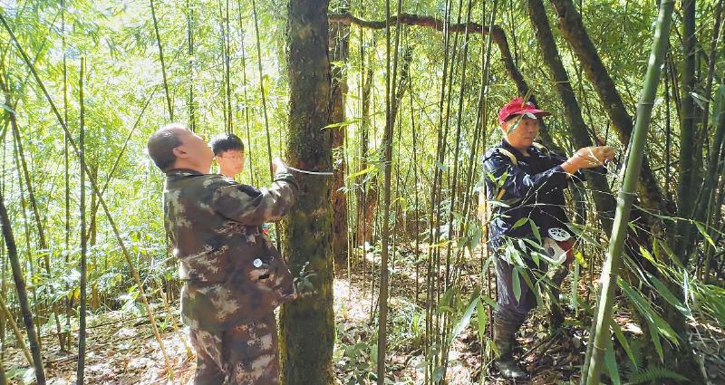 “体检”也讲究经验和技巧。面对记者对树高目测法的疑问,常博说,秘诀在于“以身丈树”——以自身身高为标尺,估算树高相当于几个自己,就能较快得到大致树高。