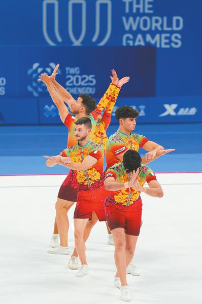 资格赛中,中国队范思伟、冯蕾、梁文杰、滕浩、许彤以19.815分排名第一晋级决赛。决赛中他们的动作兼顾高难度和艺术性,获得20.265分。确认排名第一后,队员们高举国旗绕场一周,尽情享受这一荣耀时刻。据介绍,这套动作表现了消防员救火的场景。“希望展现消防员不畏艰难、勇往直前的精神。”冯蕾说。