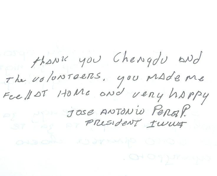 国际滑水联合会主席何塞·普列格表示,自己在成都“找到了家的感觉”:“Thank you Chengdu and the volunteers, you made me feel at home and very happy(感谢成都以及志愿者们为我们营造了宾至如归的体验,我们在此度过了快乐的时光)。”