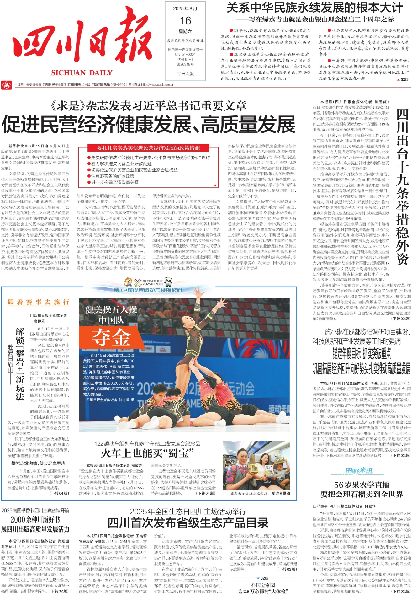 施小琳强调,要强化项目支撑,持续开展项目攻坚行动。紧扣国家所需、四川所能、群众所盼和未来所向,结合“十五五”规划编制,加强前瞻性研究,着力谋划储备一批打基础、利长远、增后劲、惠民生的大项目好项目,用足用好政策机遇,做深做实前期工作,提高项目谋划针对性有效性,努力争取更多份额更大支持。强化项目全生命周期管理,加强要素保障和跟踪调度,在保证质量和安全、守牢耕地和生态红线前提下,加力加劲推动重点产业项目落地见效,联动促进成渝中线和成达万高铁、成渝高速扩容等项目早建成早投用,加强机场高铁等交通无缝衔接,完善提升枢纽功能,大力发展临空经济、高铁经济,加速推进成德眉资同城化,推动成渝地区双城经济圈建设走深走实。要落实重大部署,推动重点领域加快突破。促进科技创新和产业创新融合发展,加强关键技术协同攻关,着力解决一批“卡脖子”问题,加快建设从创新成果发现、概念验证、中试熟化到产业化的全链条服务体系,推动高水平科技成果降维应用、沿途下蛋、外溢转化,科学规划布局产业园区,促进主体、人才、金融等要素集聚,跨区域协同构建产业链生态圈,积极打造电子信息、商业航天、医药健康等增长引擎,加快培育发展新质生产力。多措并举促进消费提质扩容,精准推进以旧换新,扩大汽车、家电等消费;抓住成都世运会、暑期和中秋国庆等契机开展促消费活动,持续打造并充分释放新场景新业态新平台消费活力,策划更多有影响的文旅活动;以城市更新为抓手,稳步推进城中村改造,建设更多“好房子”,大力促进房地产市场平稳健康发展。持续保障和改善民生,以人口变化和需求为导向促进优质公共服务资源均衡布局,加快建设更多家门口的“好学校”“好医院”“好中心”,整合资源、完善功能探索打造社区综合服务中心。要坚决纠治形式主义官僚主义,主动服务基层,健全长效机制,推广“报表通”等应用,切实为基层干部减负赋能。