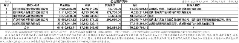 成都富润天府投资有限公司作为上述权益的受让方,现公告要求《公告资产清单》中所列包括但不限于债务人、担保人等其他相关当事人,从公告之日起立即向成都富润天府投资有限公司履行主债权合同及担保合同约定的还本付息义务或承担相应的担保责任。