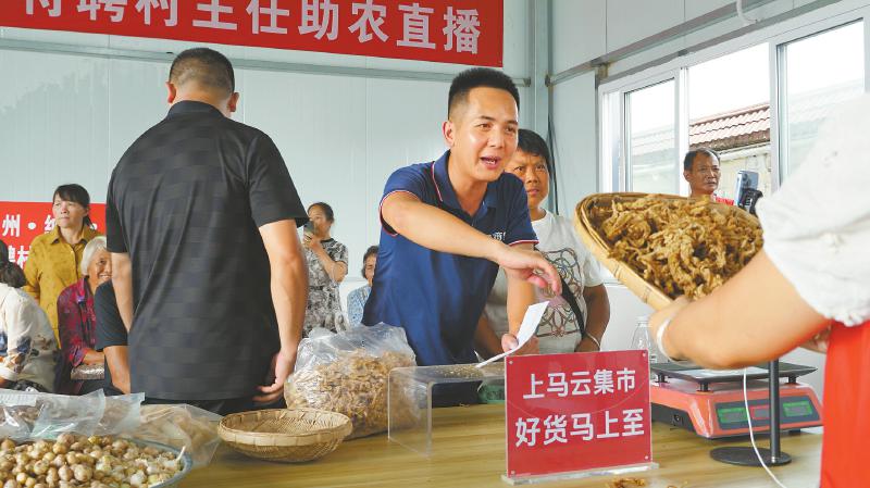 “村民有啥土货,都可以来上马云集市交易,再通过明洪强直播间代卖出去。只要愿意,村民都可以在直播间里为自己的货物‘代言’。”太平村党总支书记徐明刚引导乡亲们排队卖货。“家人们看一看,除了卖大米,我们还卖菜籽、花生、蔬果……”忙里偷闲,徐明刚时不时会“闯”进直播间,吆喝几嗓子。