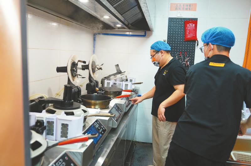 在秋金川味小炒的后厨,6台炒菜机器人正在运转。厨师周鑫一边忙碌一边介绍:“我们是2个人操作6台机器,基本上一个菜1到2分钟就能出锅,效率很高。”谈到操作技术要求,周鑫说:“程序都是公司提前编制好的,直接下发到门店的炒菜机上,我们只需要点选菜名,它就会自动开始炒制。”