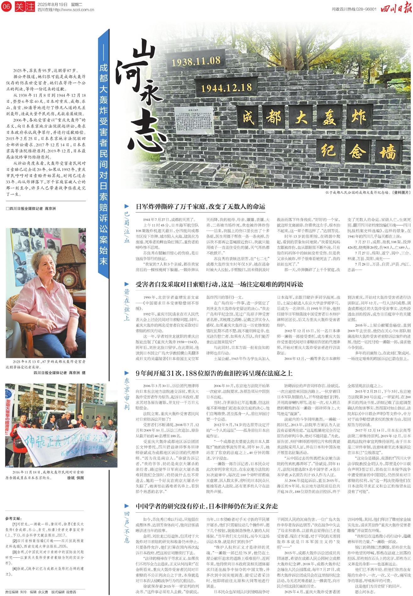 位于成都人民公园的成都大轰炸纪念墙。(资料图片)2025年8月13日,87岁的成都大轰炸受害者达朋芳接受记者采访。 四川日报全媒体记者 蒋京洲 摄2016年11月18日,成都大轰炸民间对日索赔原告团成员在日本东京街头。 徐斌 供图