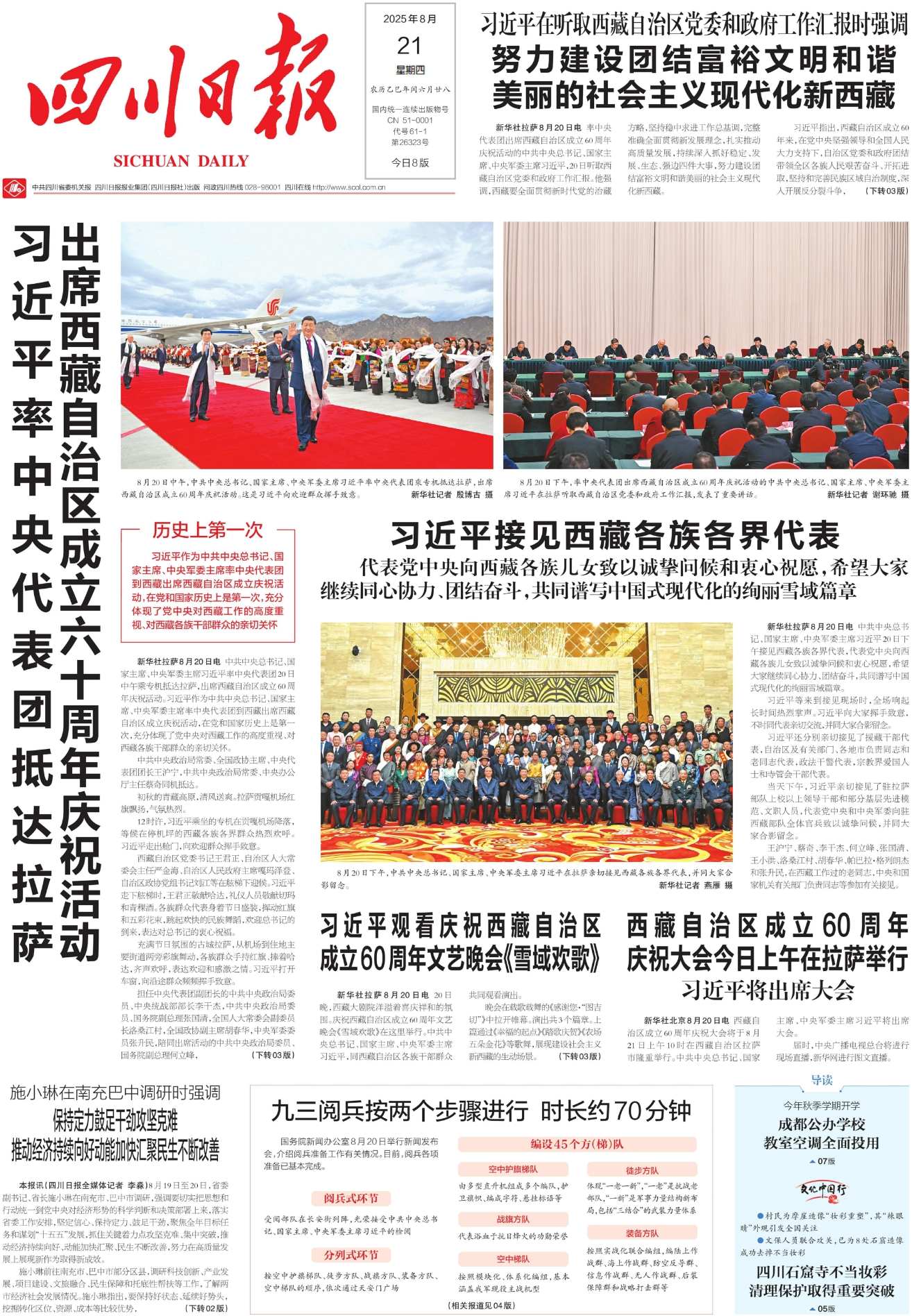新华社拉萨8月20日电 率中央代表团出席西藏自治区成立60周年庆祝活动的中共中央总书记、国家主席、中央军委主席习近平,20日听取西藏自治区党委和政府工作汇报。他强调,西藏要全面贯彻新时代党的治藏方略,坚持稳中求进工作总基调,完整准确全面贯彻新发展理念,扎实推动高质量发展,持续深入抓好稳定、发展、生态、强边四件大事,努力建设团结富裕文明和谐美丽的社会主义现代化新西藏。