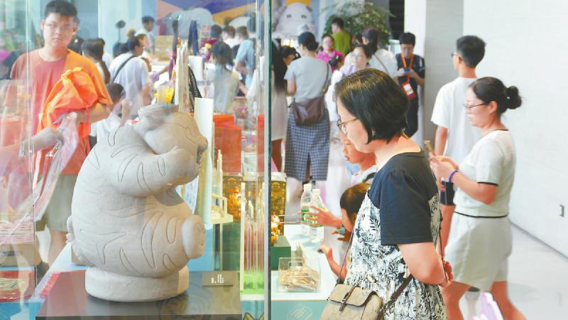 在成博相关文创展区,胖虎形象不仅与馆藏文物石犀、唐代金香囊同框,还生动演绎了吃火锅、搓麻将的本地生活。在展厅外,馆方特意复制了视频原款胖虎俳优俑,供观众打卡留念。