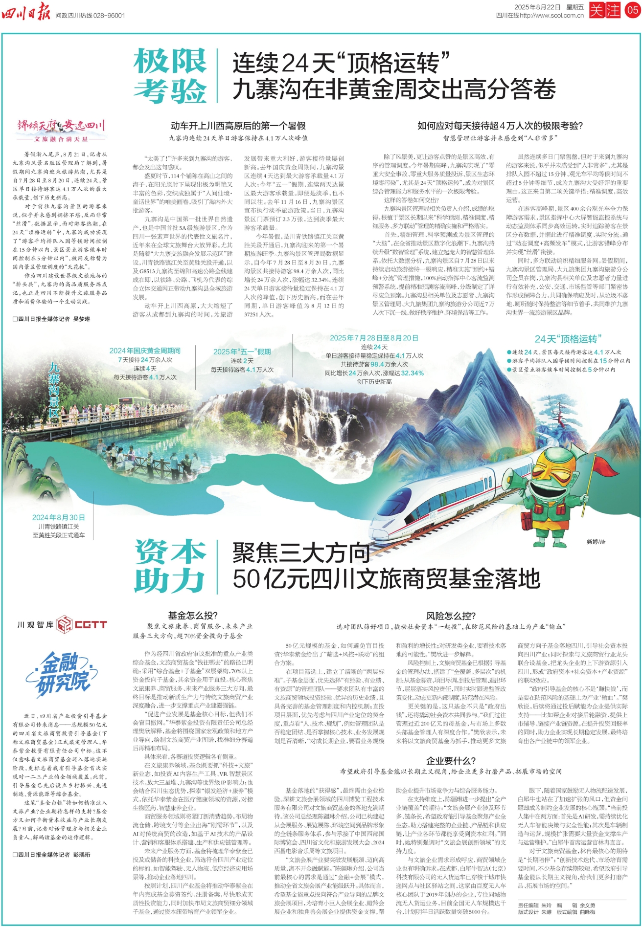 按照计划,四川产业基金将推动华泰紫金在年内完成基金募资签约、注册备案,尽快形成实质性投资能力,同时加快布局文旅商贸细分领域子基金,通过资本纽带培育产业领军企业。