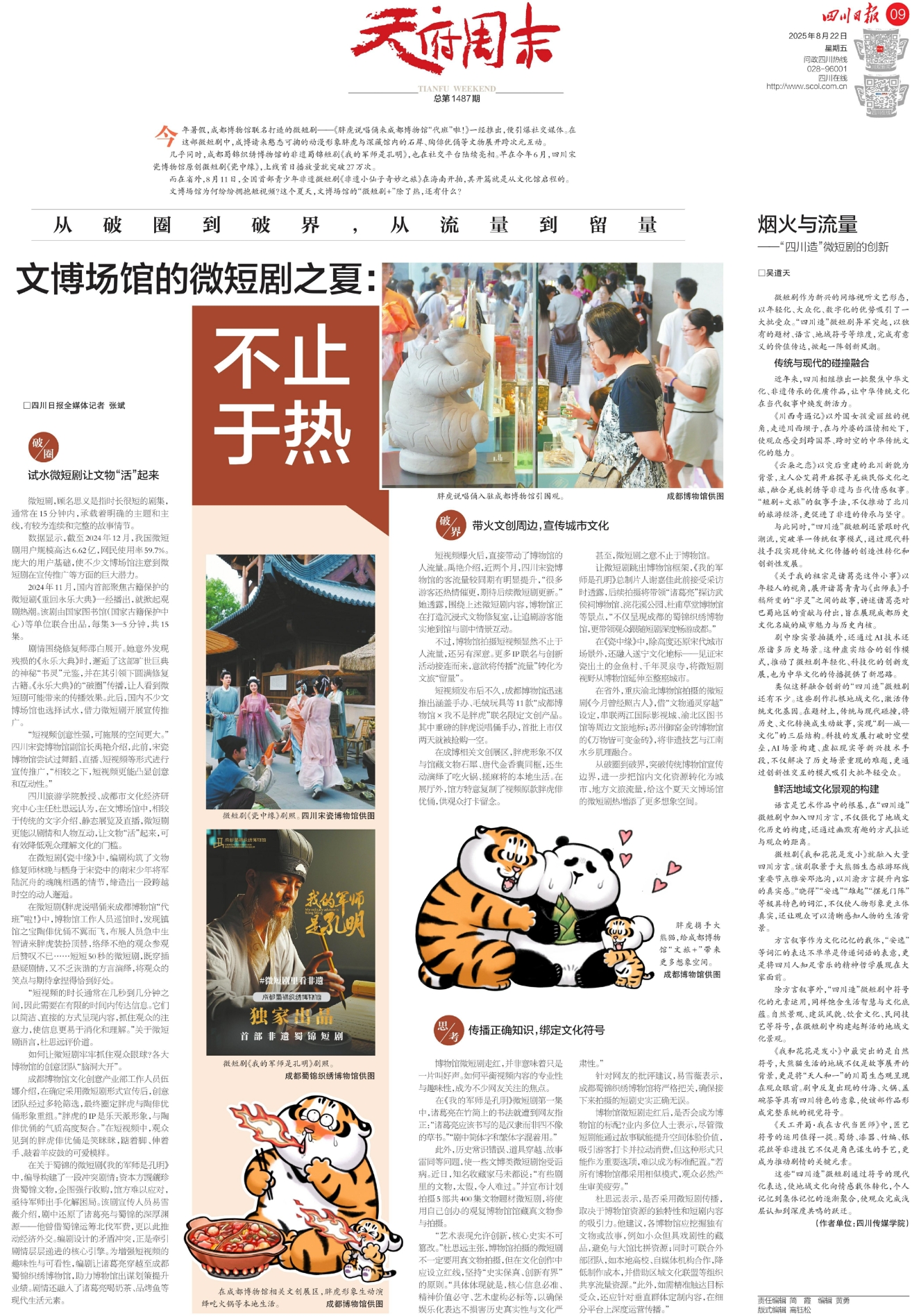 胖虎说唱俑入驻成都博物馆引围观。 成都博物馆供图微短剧《瓷中缘》剧照。四川宋瓷博物馆供图微短剧《我的军师是孔明》剧照。 成都蜀锦织绣博物馆供图在成都博物馆相关文创展区,胖虎形象生动演绎吃火锅等本地生活。 成都博物馆供图胖虎携手大熊猫,给成都博物馆“文旅+”带来更多想象空间。成都博物馆供图