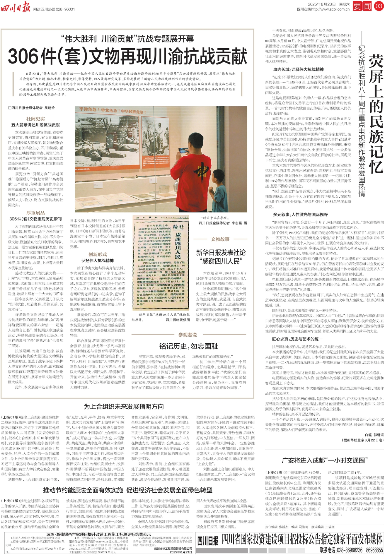 一个个鲜活的人物、一段段感人的故事,将伟大抗战精神形象化、生动化。这些饱含家国情怀的电视新作,必将唤起人们对历史的铭记、对先烈的缅怀、对和平的珍爱,激励人们开创更加美好的未来。