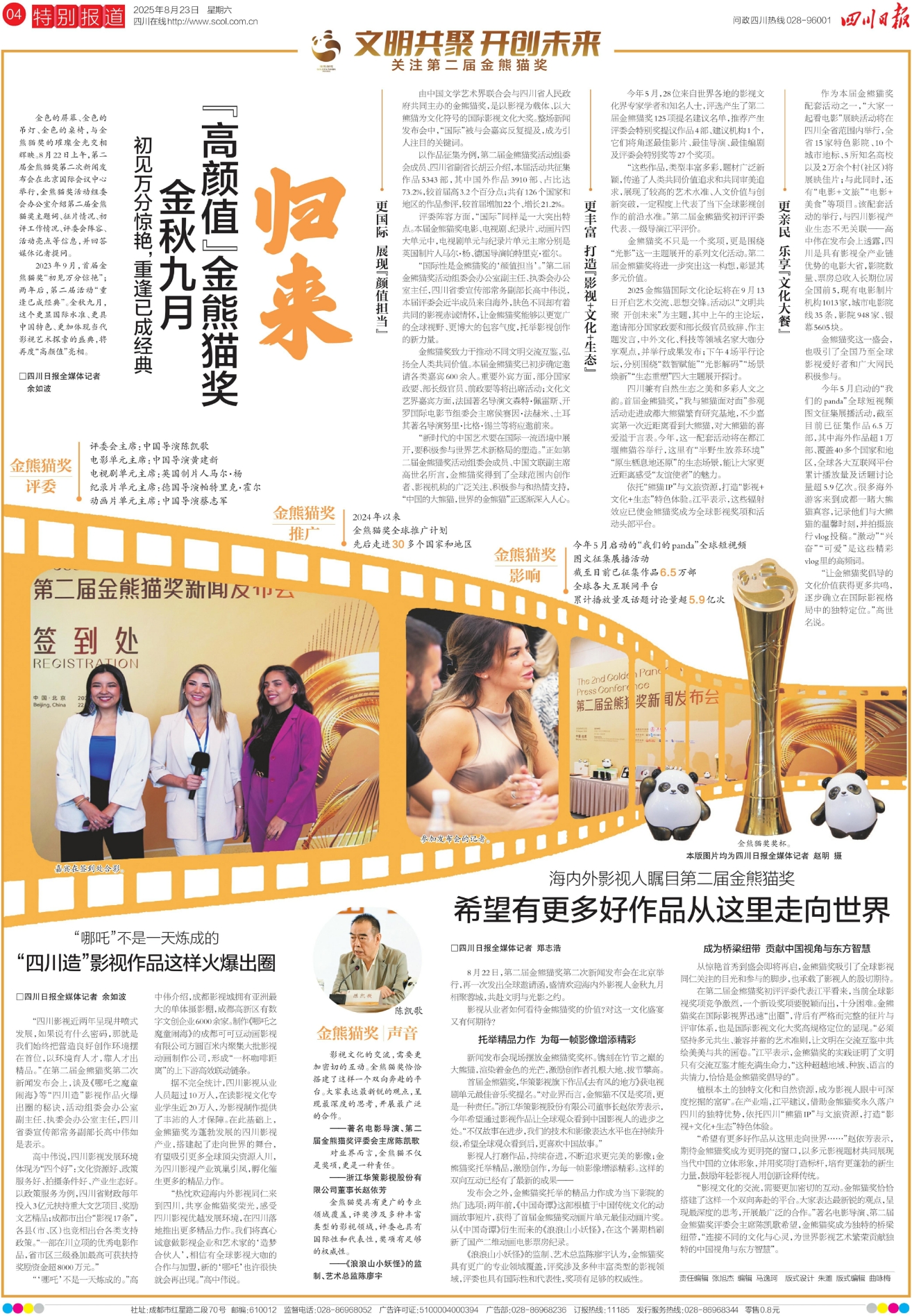 影视文化的交流,需要更加密切的互动。金熊猫奖恰恰搭建了这样一个双向奔赴的平台。大家表达最新锐的观点,呈现最深度的思考,开展最广泛的合作。 ——著名电影导演、第二届金熊猫奖评委会主席陈凯歌 对业界而言,金熊猫不仅是奖项,更是一种责任。 ——浙江华策影视股份有限公司董事长赵依芳 金熊猫奖具有更广的专业领域覆盖,评奖涉及多种丰富类型的影视领域,评委也具有国际性和代表性,奖项有足够的权威性。 ——《浪浪山小妖怪》的监制、艺术总监陈廖宇