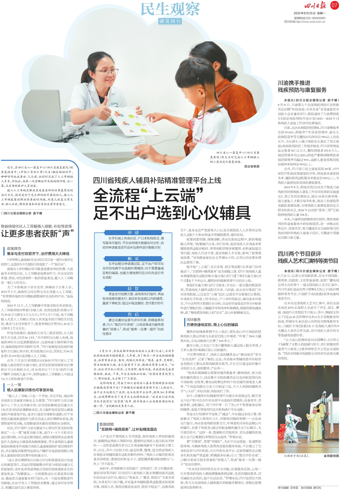 此外,四川省已设立康复医院48家,1777家医疗机构设置康复医学科,两地基本康复服务率、辅助器具适配服务率稳定在95%以上,为残疾人提供优质高效的康复服务。