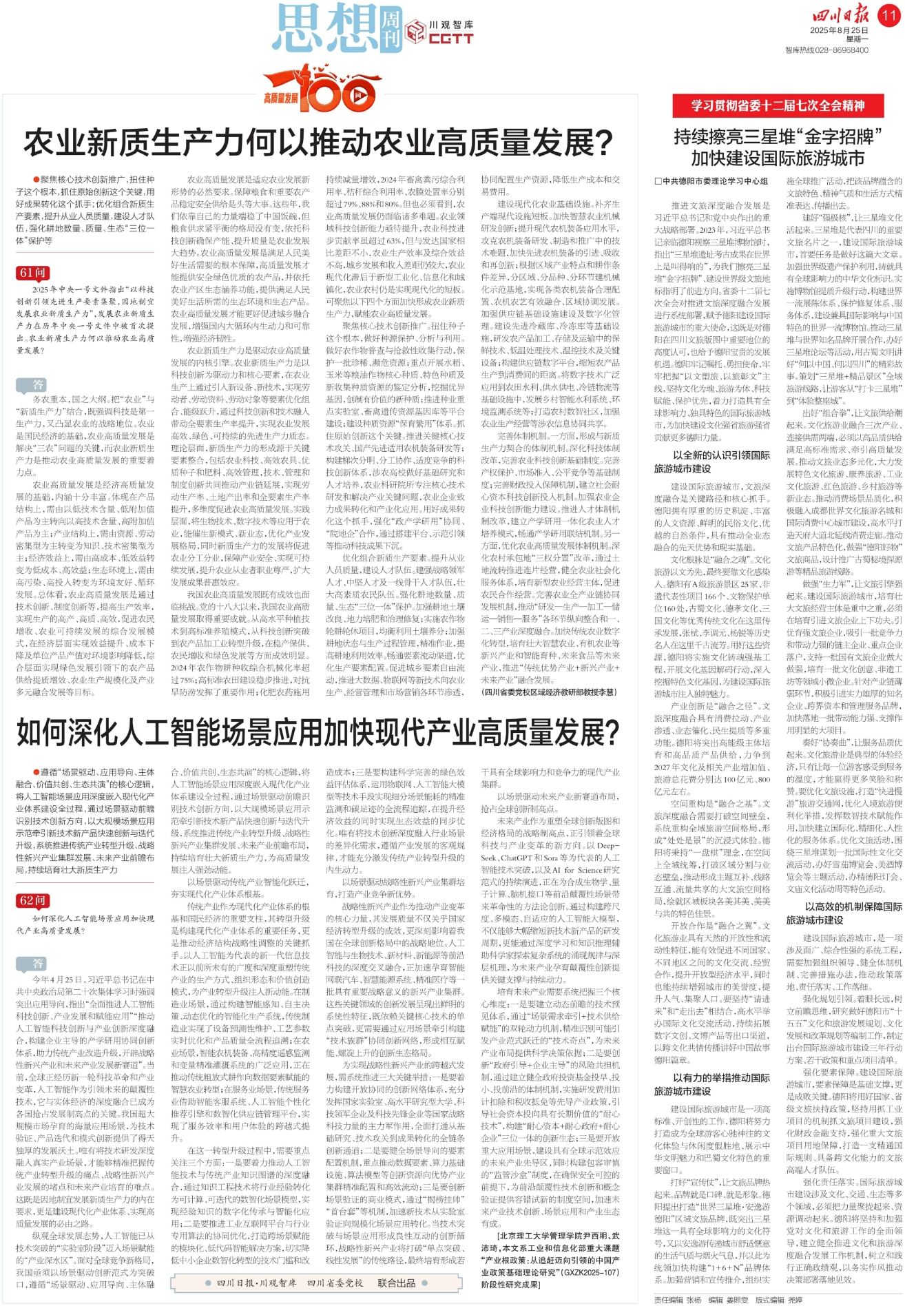 奏好“协奏曲”,让服务品质优起来。文化旅游业是典型的体验经济,只有让每一位游客感受到服务的温度,才能赢得更多笑脸和称赞。要优化文旅设施,打造“快进慢游”旅游交通网,优化入境旅游便利化举措,发挥数智技术赋能作用,加快建立国际化、精细化、人性化的服务体系。优化文旅活动,围绕三星堆谋划一批国际性文化交流活动,办好雪茄博览会、美酒博览会等主题活动,办精德阳灯会、文庙文化活动周等特色活动。
