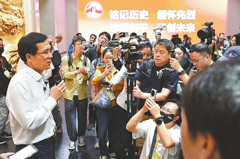 8月27日,中国人民抗日战争暨世界反法西斯战争胜利80周年纪念活动新闻中心举行首场外出参观采访活动,组织近200名境内外记者赴中国人民抗日战争纪念馆等地参观采访,观看《为了民族解放与世界和平——纪念中国人民抗日战争暨世界反法西斯战争胜利80周年》主题展览。参加活动的记者来自60多个国家和地区的130余家境内外媒体。 新华社记者 张玉薇 摄