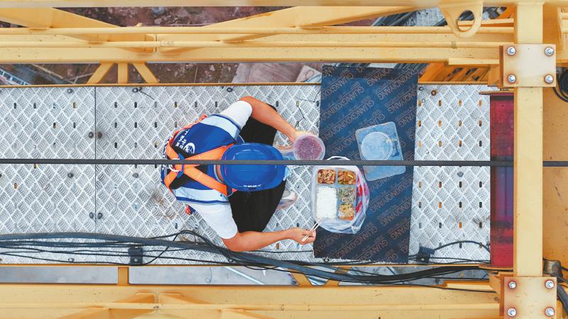 杨廷光的工作地点是离地54米高的塔吊驾驶舱。他要在安全护具的保护下垂直攀爬十多分钟,才能抵达不足2平方米的“云端小屋”,等到下班才会重回地面。留在地面的郭敏则通过手中的对讲机,为高空中的丈夫指引物料吊装作业。