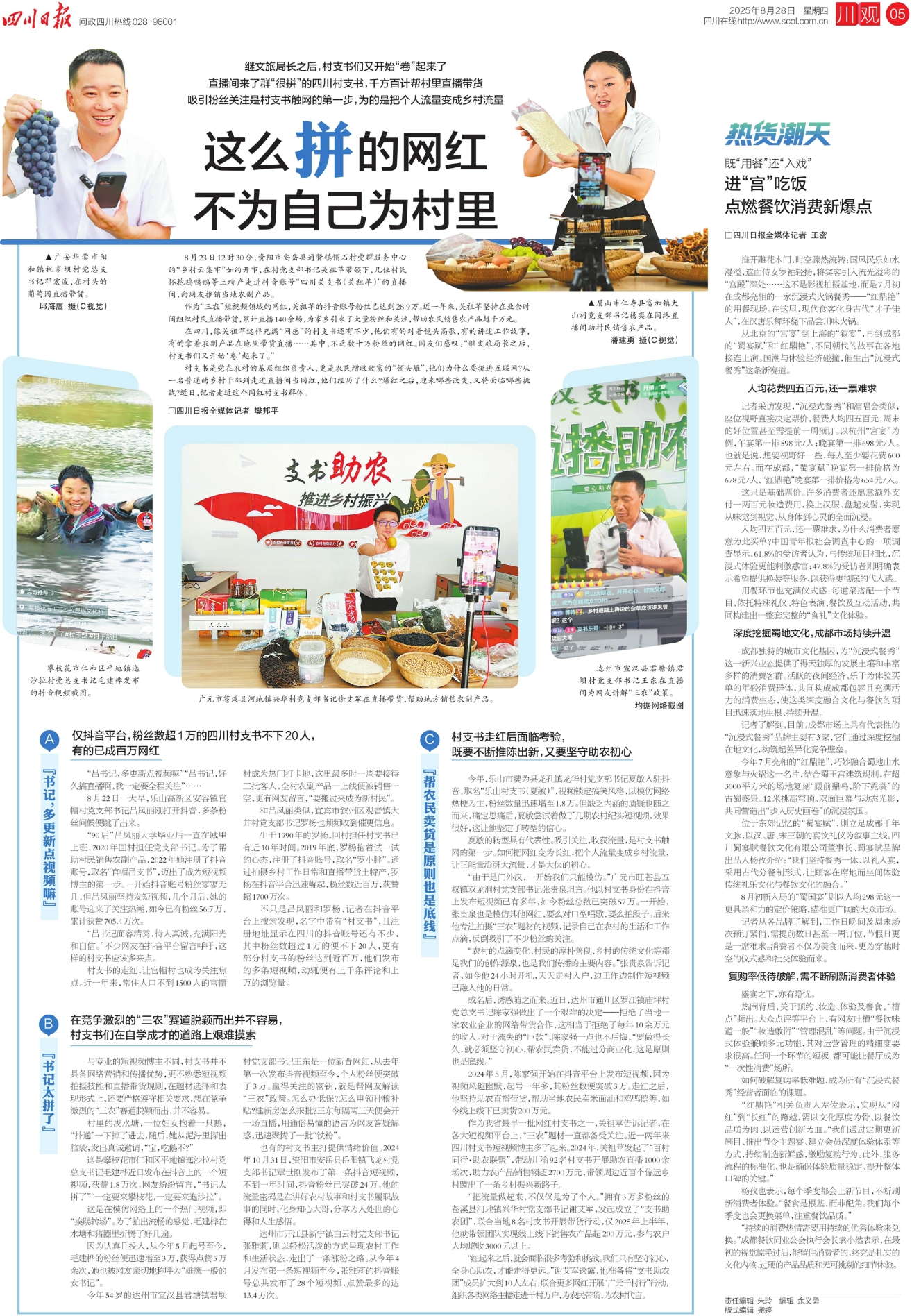 广安华蓥市阳和镇祝家坝村党总支书记邓宏波,在村头的葡萄园直播带货。 邱海鹰 摄(C视觉)眉山市仁寿县富加镇大山村党支部书记杨奕在网络直播间助村民销售农产品。 潘建勇 摄(C视觉)攀枝花市仁和区平地镇迤沙拉村党总支书记毛建桦发布的抖音视频截图。达州市宣汉县君塘镇君坝村党支部书记王东在直播间为网友讲解“三农”政策。 均据网络截图广元市苍溪县河地镇兴华村党支部书记谢艾军在直播带货,帮助地方销售农副产品。