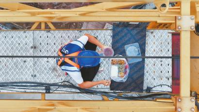 在塔吊上工作的杨廷光。杨廷光在塔吊上吃午饭。郭敏为高空中的杨廷光指引物料吊装作业。扫码看视频,“夫妻档”的一天
