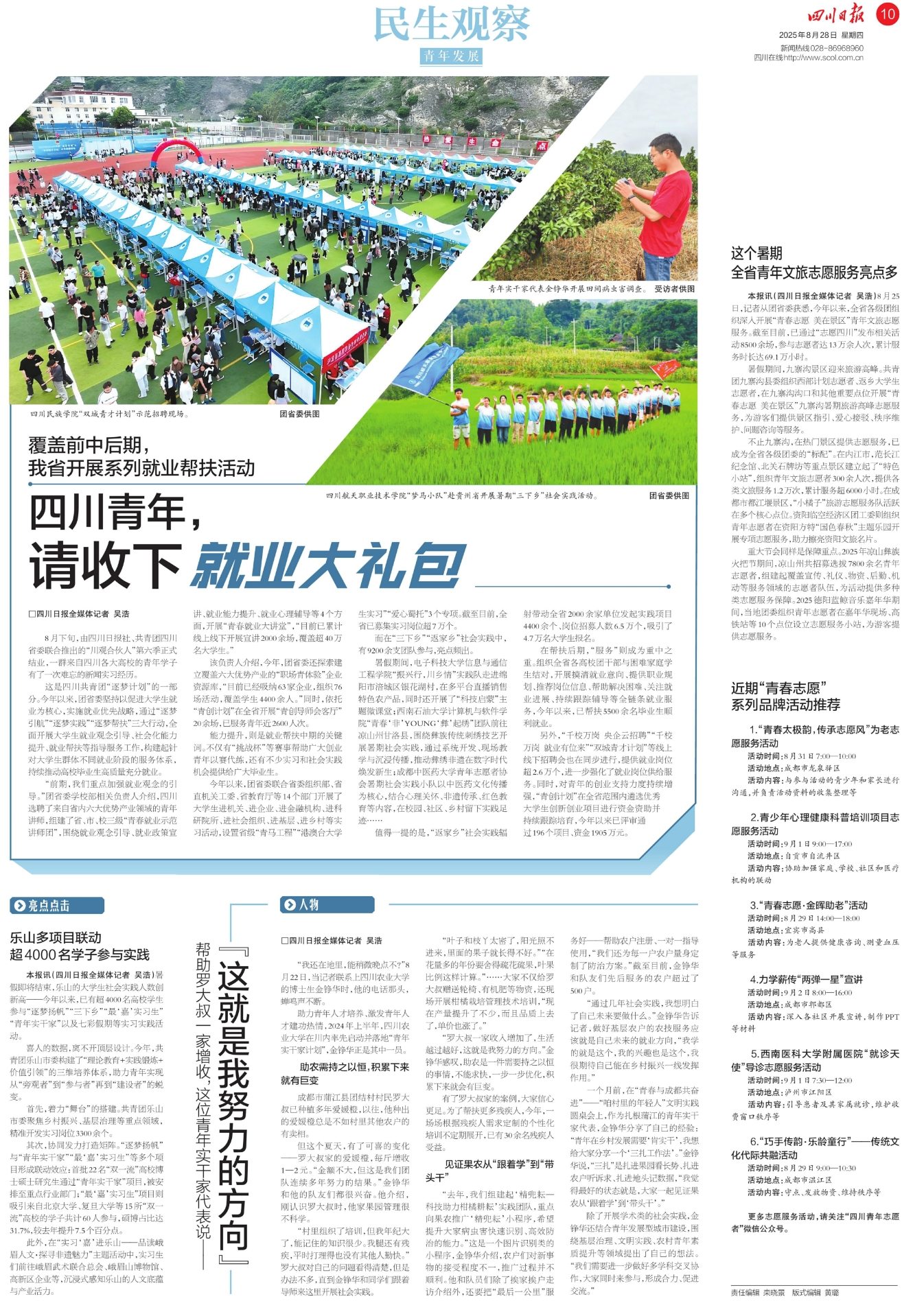 四川民族学院“双城青才计划”示范招聘现场。 团省委供图青年实干家代表金铮华开展田间病虫害调查。 受访者供图四川航天职业技术学院“梦马小队”赴贵州省开展暑期“三下乡”社会实践活动。 团省委供图
