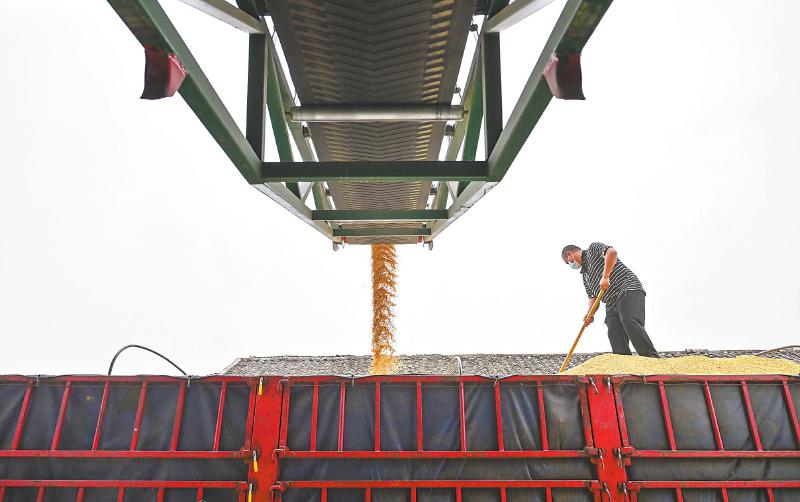 8月30日,广安市广安区花桥镇粮食烘干中心,烘干后的稻谷通过传送带源源不断装入货车,即将运往国家粮库。