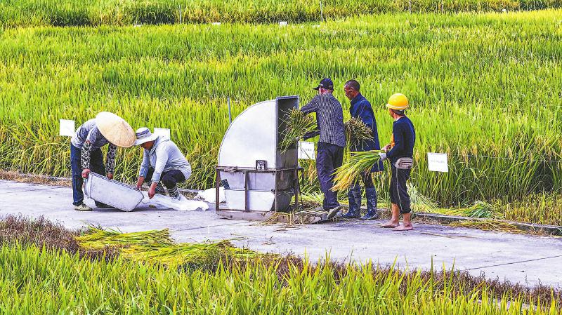 8月27日,崇州市隆兴镇四川农业大学现代农业研发基地内,科研人员正对新品水稻“雅香9A/CK51”分类测产。