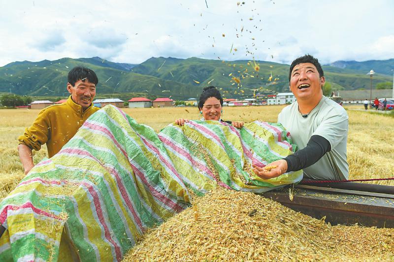 8月29日,甘孜州甘孜县拖坝乡拖坝村,当地村民抢收成熟的青稞。